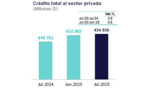 El crédito total al sector privado creció 3,8% en julio con respecto al mismo mes de 2024, la tasa más alta desde inicios de 2023, registrando además una aceleración de su tasa de crecimiento interanual por tercer mes consecutivo. Con relación a junio de este año, el aumento fue 0,6 por ciento.