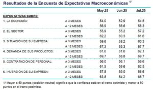 En julio de 2025, las expectativas empresariales en Perú mostraron una recuperación casi generalizada respecto a junio, manteniéndose en el tramo optimista en todos los plazos y variables evaluadas.