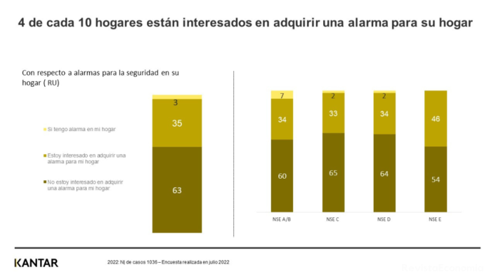El estudio de Kantar concluye que un 35% de hogares peruanos contempla adquirir una alarma, es decir 4 de cada 10 hogares; mientras que solo un 3% cuenta con este tipo de servicio actualmente. Esta tendencia se mantiene en todos los niveles socioeconómicos, así tenemos que en el NSE E el interés por este servicio es de 46%, en el NSE D es de un 34%, en el NSE C es de 33%, y en el NSE A/B es de 34%.