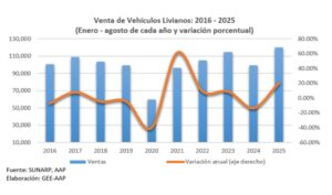 De acuerdo con los datos oficiales proporcionados por la Superintendencia Nacional de los Registros Públicos (Sunarp), la venta de vehículos livianos nuevos alcanzó las 16,185 unidades durante agosto de 2025, lo que representa un incremento del 26.7% en comparación con el mismo mes del año anterior. Asimismo, en el acumulado de los primeros ocho meses del año, la comercialización de dichos vehículos totalizó 119,874 unidades, superando en un 20.6% el volumen registrado en el mismo periodo de 2024.