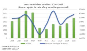 El mercado de minibuses y ómnibus nuevos también ha mostrado una tendencia positiva en lo que va del año, con un desempeño sólido en agosto, mes en el que se comercializaron 289 unidades (+30.8%). En el acumulado de enero a agosto, las ventas ascendieron a 2,462 unidades, reflejando una expansión del 35.9% respecto al mismo periodo de 2024. Este repunte responde a la reactivación de sectores intensivos en transporte de pasajeros, como el turismo y los servicios vinculados (hoteles, restaurantes, entretenimiento), que han retomado su dinamismo tras años marcados por la pandemia, la conflictividad social y fenómenos climáticos. “La ausencia de estos shocks ha permitido una normalización operativa, mientras que el fortalecimiento del consumo interno y la inversión privada en el 2024 y lo que va del 2025 han contribuido a estimular la demanda de movilidad. En este contexto, las empresas del sector vienen optando por la renovación de flotas y la incorporación de nuevas unidades, en un entorno de mayor crecimiento y predictibilidad”, indicó Morisaki.