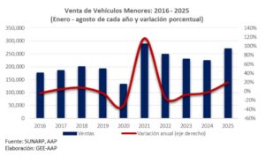 El segmento de vehículos menores continuó mostrando un desempeño destacado en agosto de 2025, al comercializarse 36,918 unidades (+16.2%). Asimismo, en los primeros ocho meses del año, las ventas alcanzaron 269,364 unidades, con una expansión del 19.9% respecto al mismo periodo de 2024. Este crecimiento ha sido liderado por las motocicletas, que concentraron 186,844 unidades (+18.3%), seguidas por las trimotos, con 82,520 unidades (+23.7%).